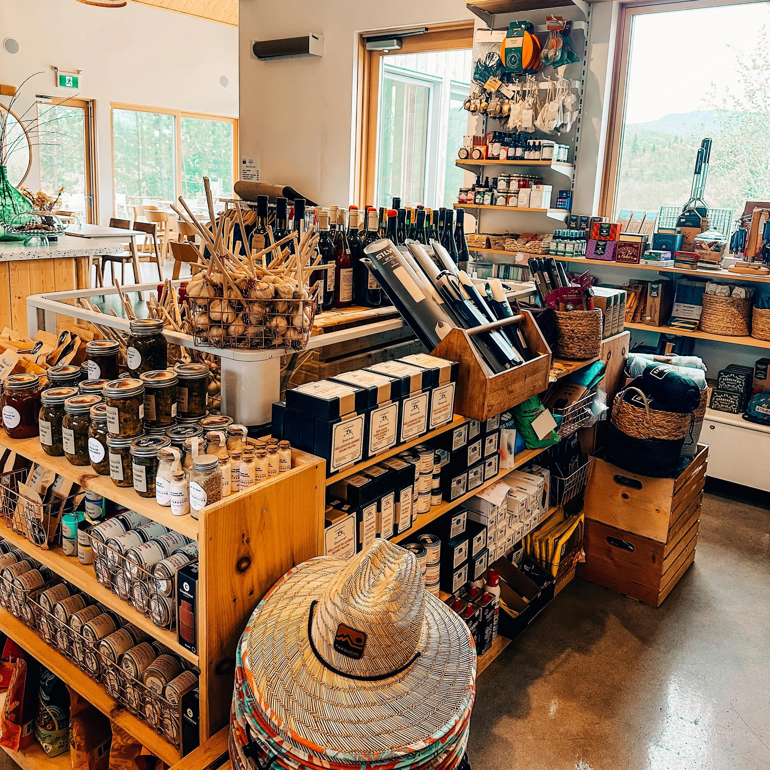On y découvre une sélection choisie avec intention — produits locaux et de saison, trouvailles du territoire, ingrédients prêts à griller sur le feu, à partager en pique-nique ou à ouvrir au coucher du soleil. Rien d’abondant, rien de superflu. Seulement ce qui est juste, bon et ancré ici.