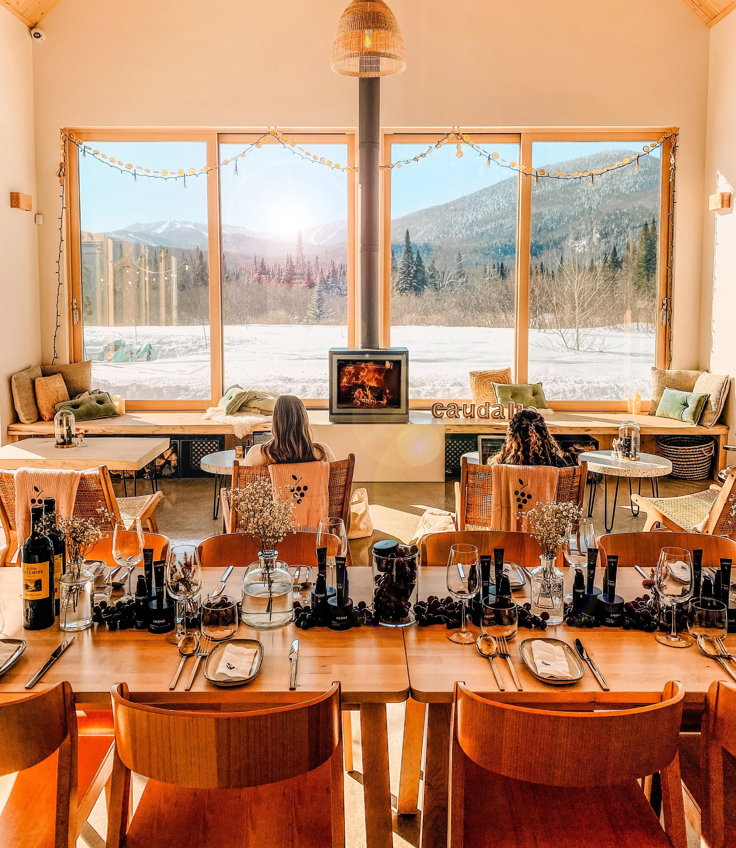 Clore la journée, un verre local à la main, près du feu, pendant que le soleil disparaît derrière la montagne.